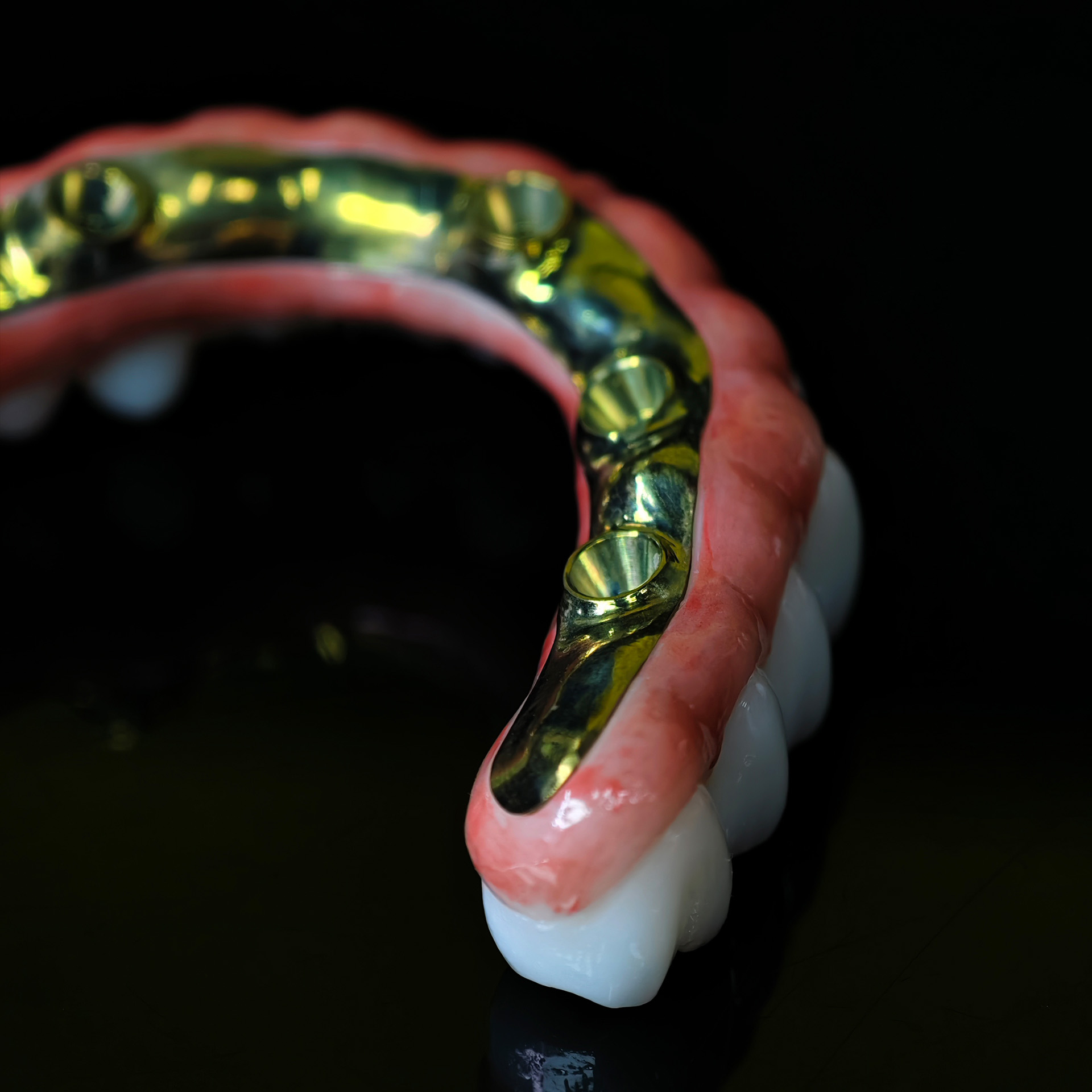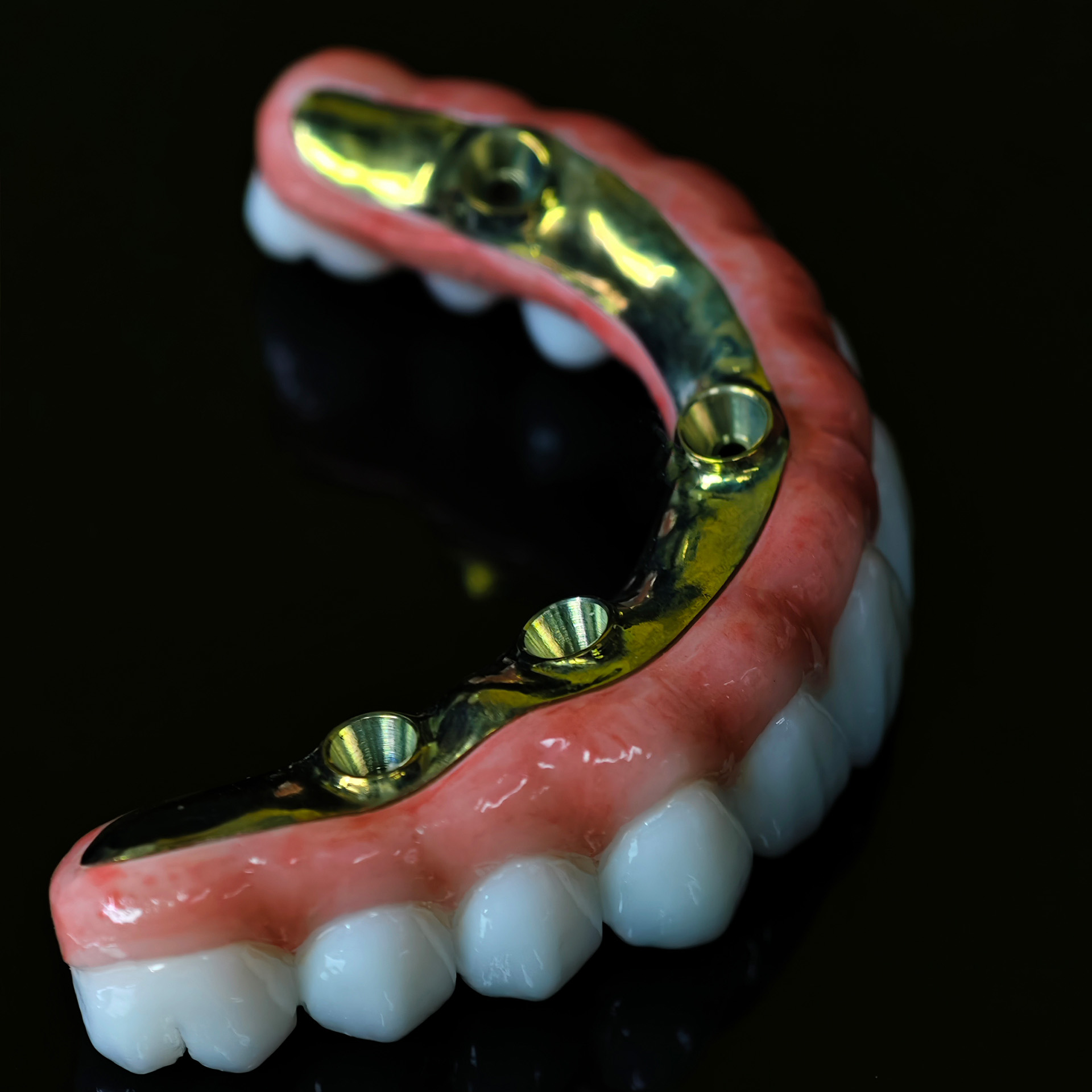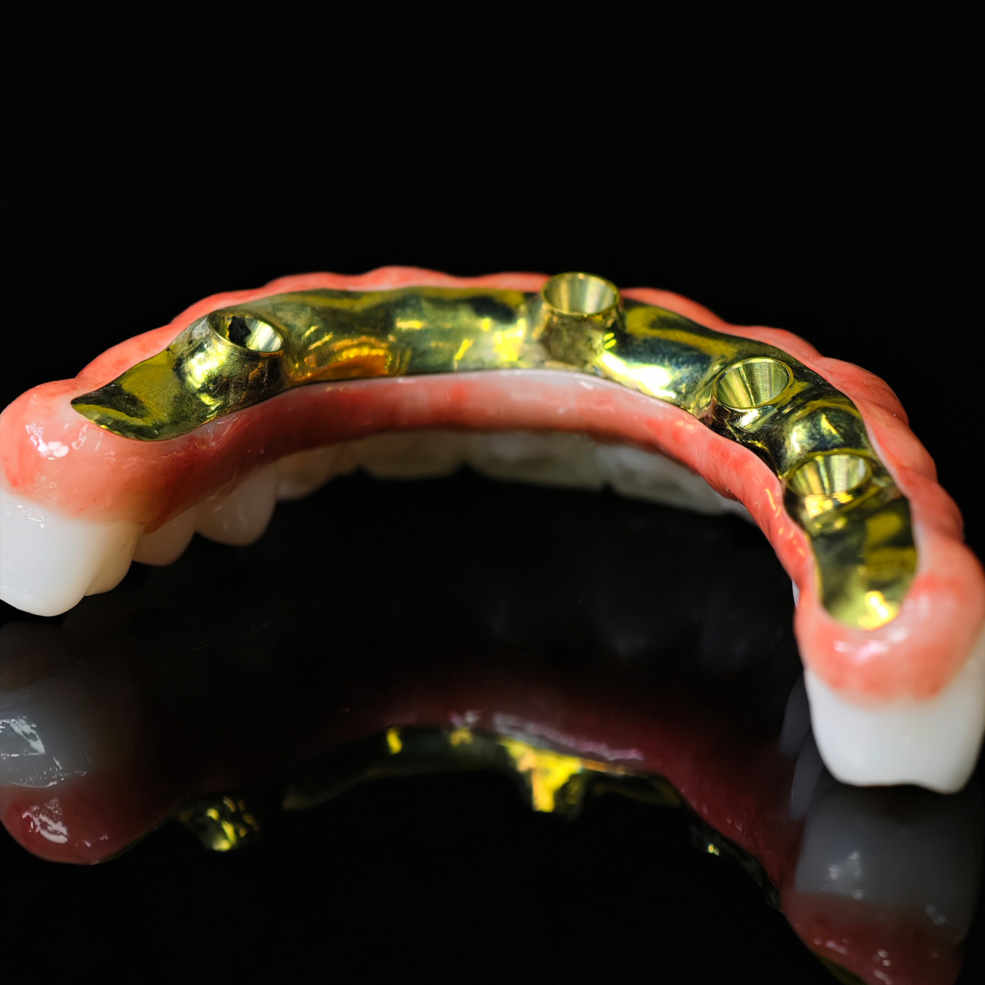 Our Zirconia bridge with titanium substructure delivers an engineered solution for space-limited Full arch cases, combining titanium's proven strength with zirconia's superior esthetics through direct-to-implant engagement that eliminates traditional multi-component complexity.