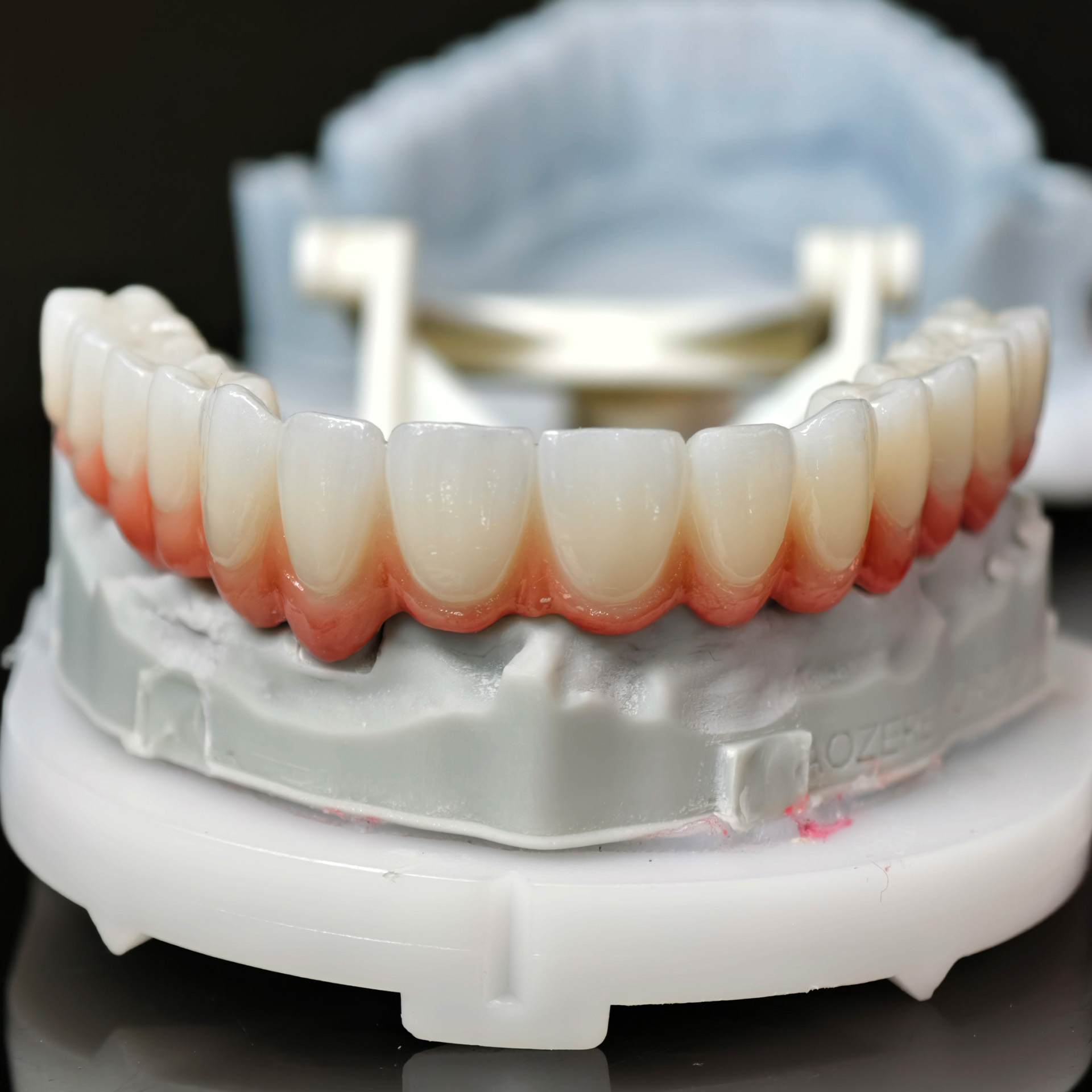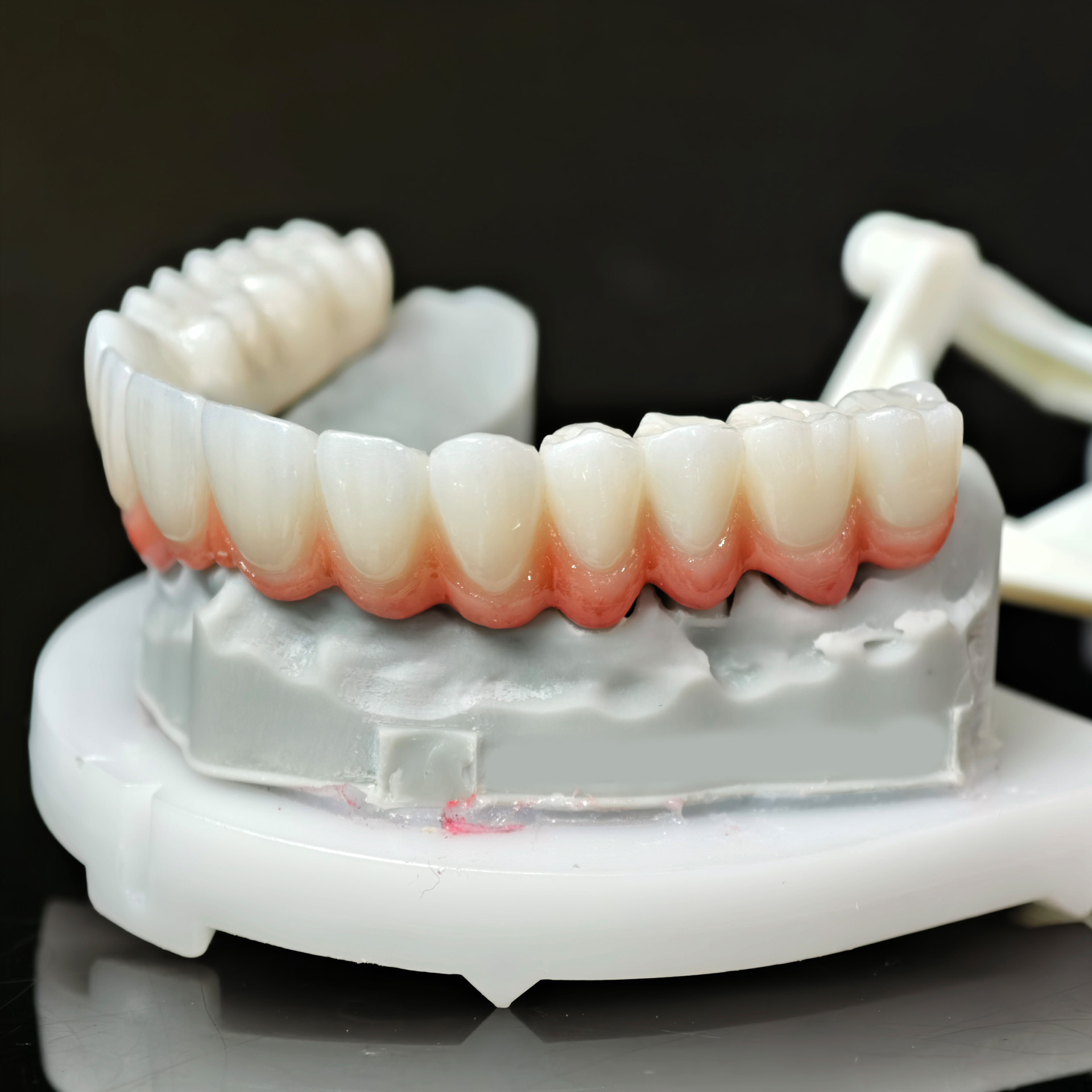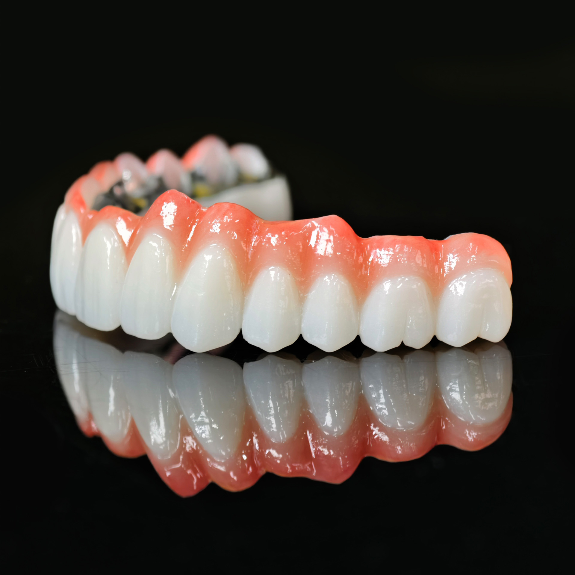 The bridge is typically fabricated from monolithic or layered zirconia, offering high strength and superior aesthetics.